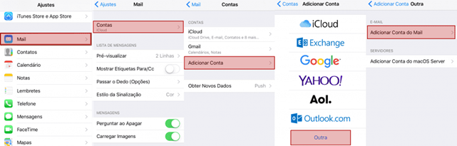 Nas próximas telas, toque em Adicionar Conta e depois em Outra. Após, toque em Adicionar Conta do Mail.