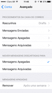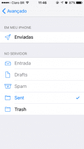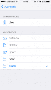Agora, é preciso definir as pastas de Lixeira e Itens Enviados para que as mensagens encaminhadas para estas pastas sejam salvas também em seu servidor de emails.